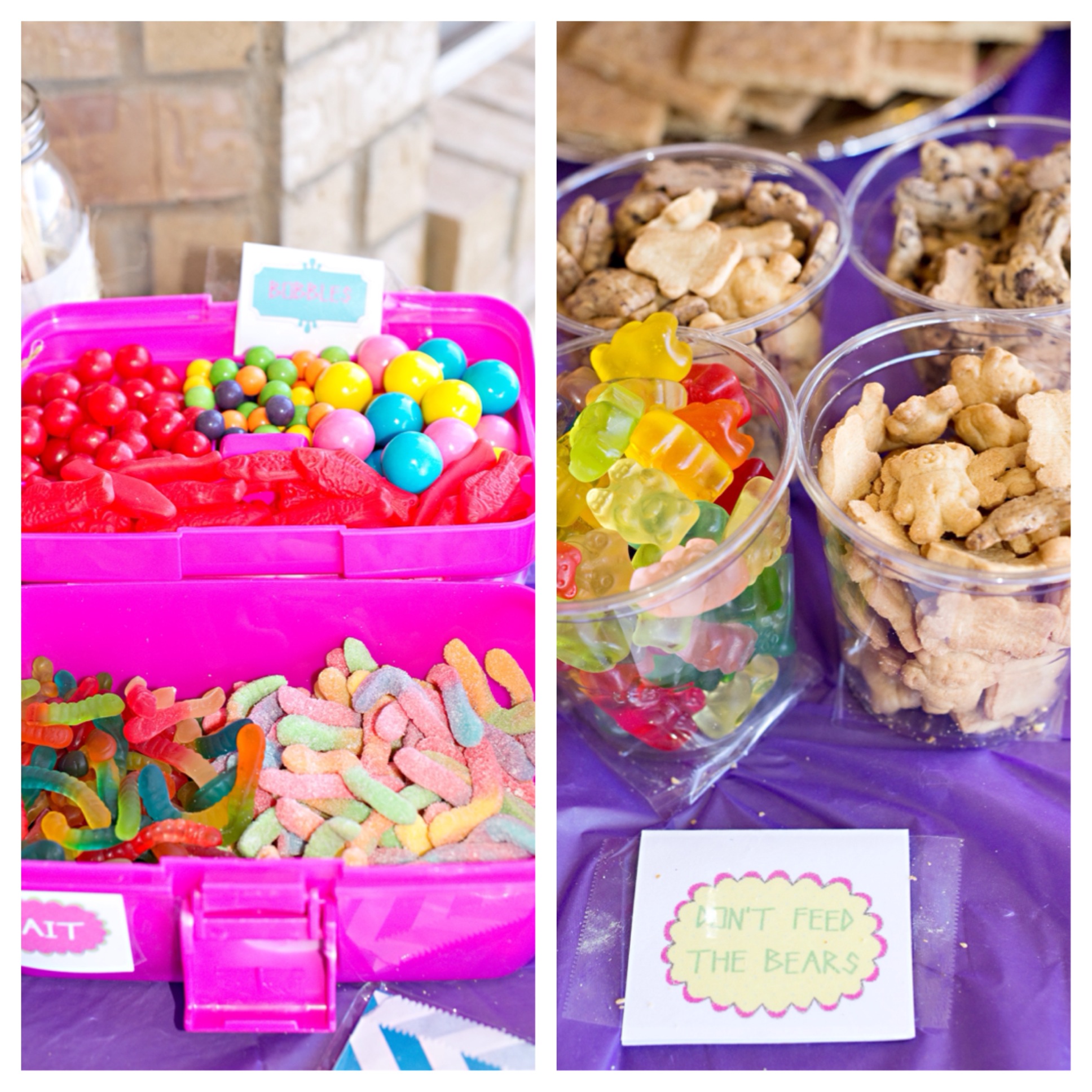 I had cute little chevron printed paper treat bags set up near a pink tackle box full of candy “bait” and cups full of different flavored teddy grahams and gummy bears for the girls to make their own sweet trail mixes.