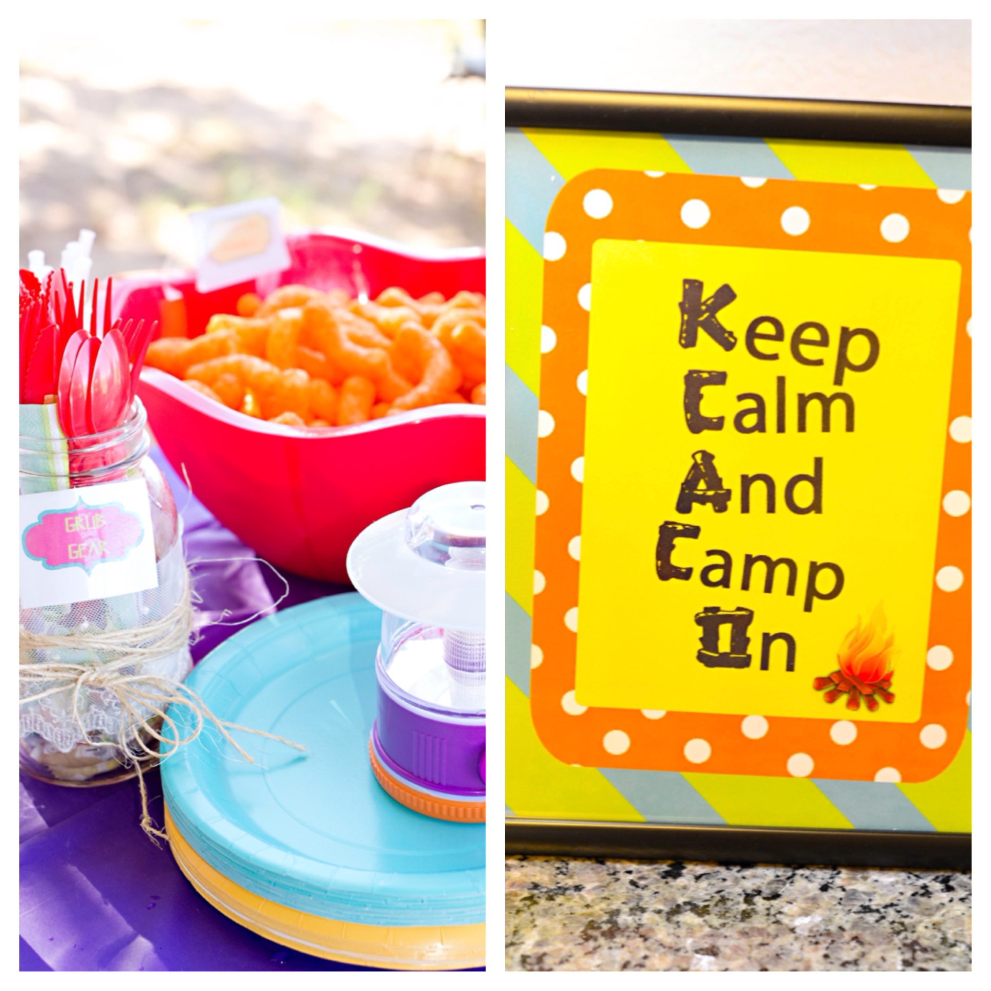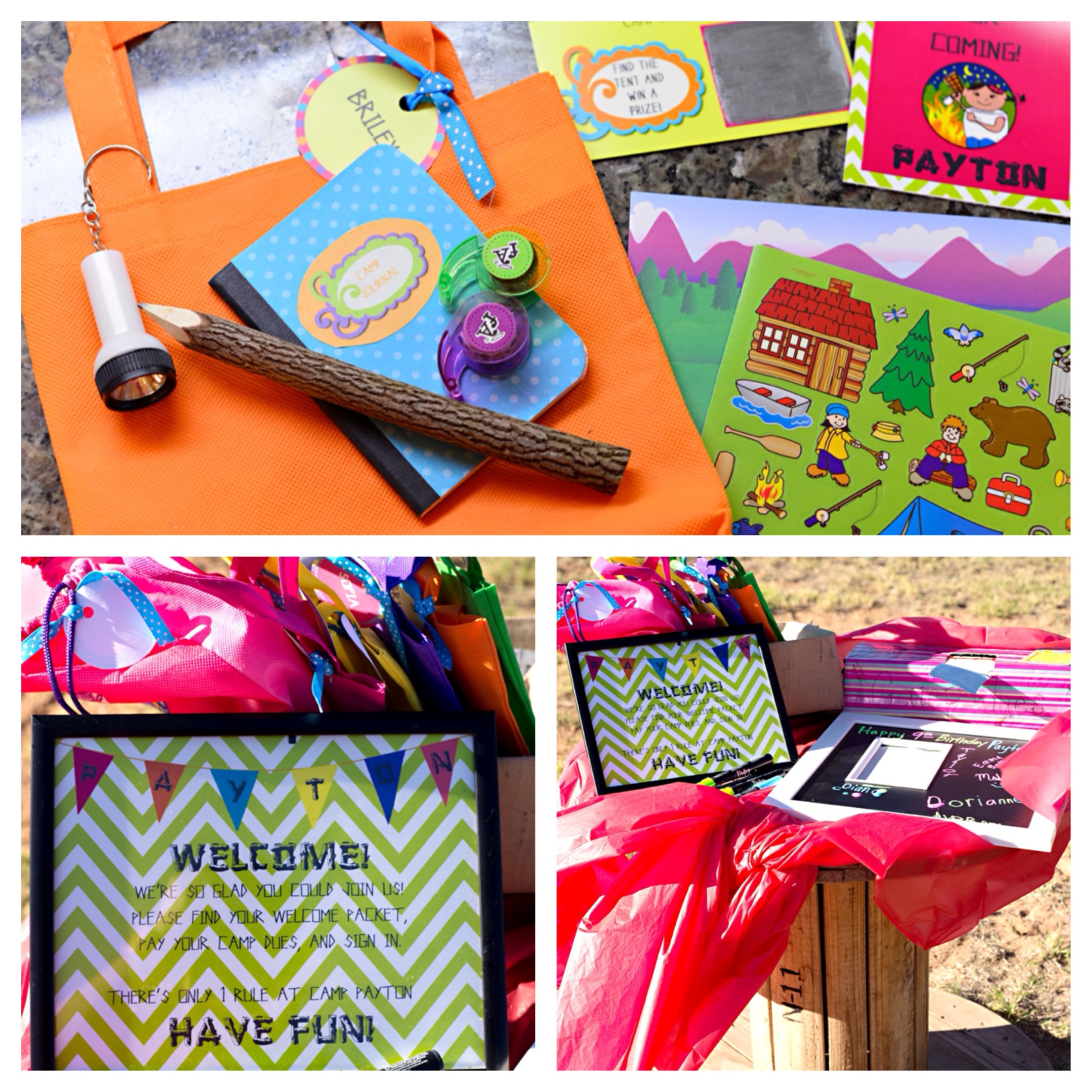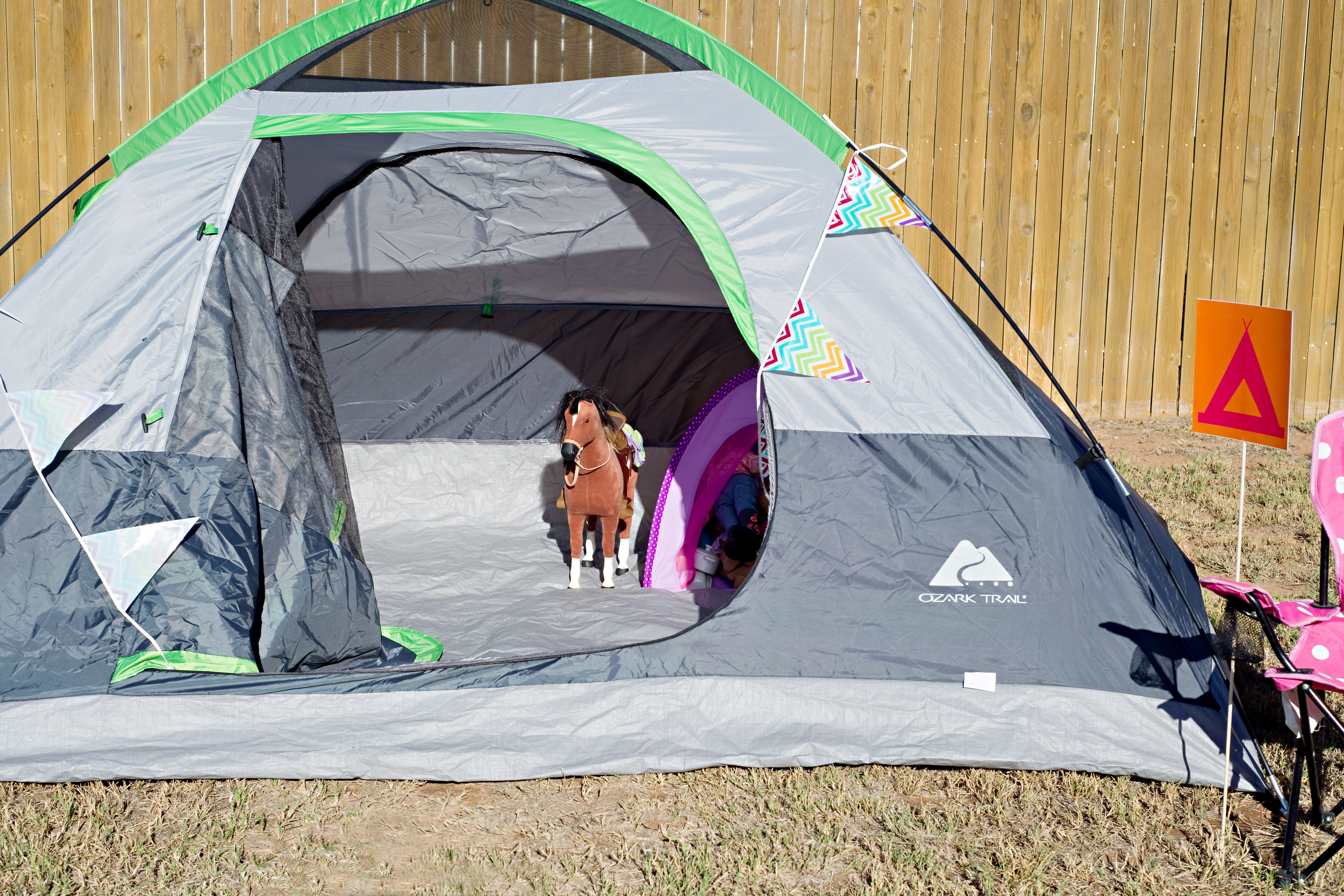 When our guests arrived, they were asked to “Register” at the camp welcome center. Here they would grab their “welcome packs” (goody bags), sign a frame for P to keep as a memory, and pay their “camp dues”. P has so much of what she wants and much more than she could ever need so instead of gifts, she asked her guests to bring their spare change to donate to one of our favorite charities. We printed out little name labels for each of our guests and used ribbon to tie them to canvas tote bags we got 2/$1 at Dollar tree. They also had a “camp journal”, mini deco tape, a cool wooden pencil, flashlight keychain, scratch off ticket, a little thank you note, and camping sticker scene activity. We got the mini flashlight keychains and sticker sheets from oriental trading. The flashlight and tape are “doll sized” which is perfect for my little AG lovers.