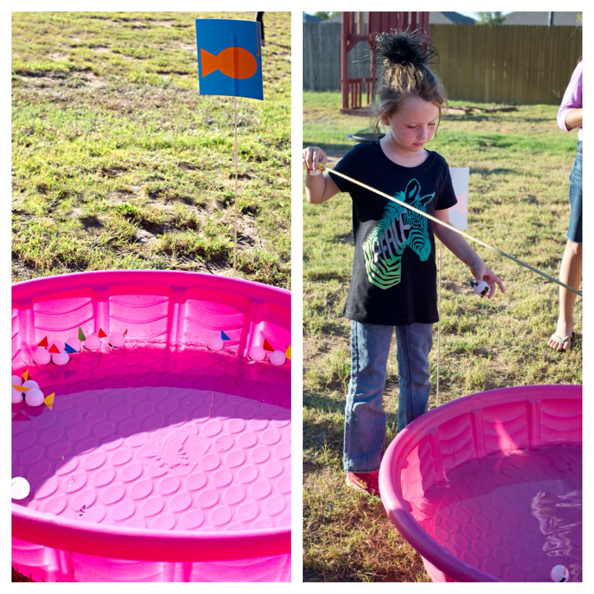 The kids also enjoyed the “fishing hole” and visited it on and off throughout the party. We got a few packages of ping pong balls at dollar tree and hot glued foam tails and magnets on them. We used dowel rods with fishing wire and a large washer on the end for fishing poles and a plastic kiddie pool I borrowed from my bestie for the pond. The girls paired up and raced to see who could catch the most fish in 1 minute. The winners got to pick a prize from the prize box (sticker sheets and more Michael’s fun finds).