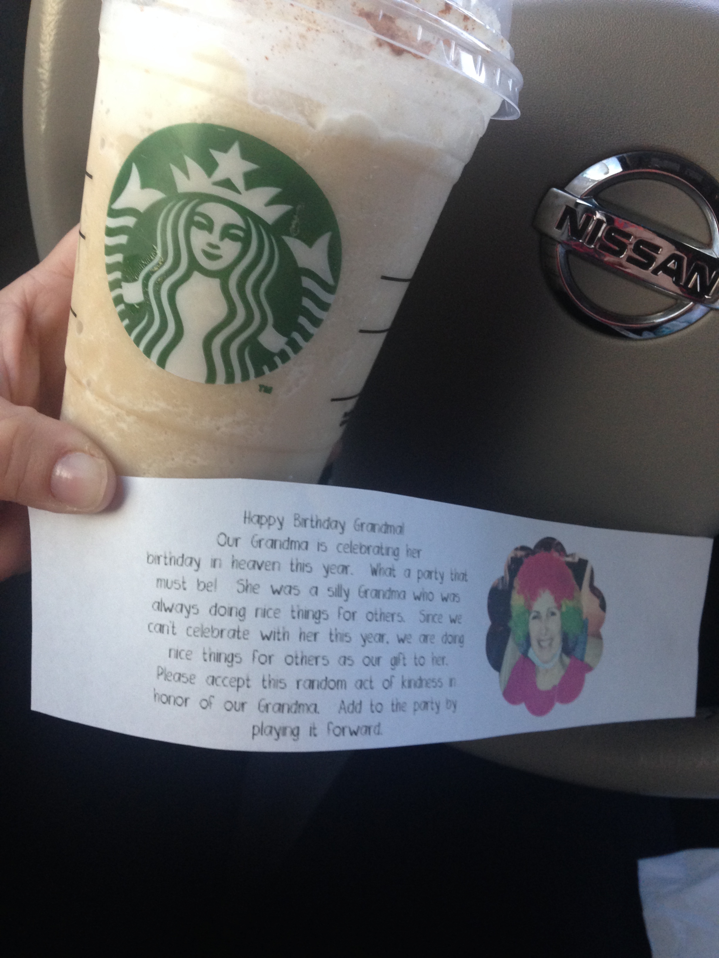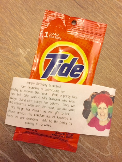 “Our Grandma is celebrating her birthday in heaven this year. What a party that must be! She was a silly Grandma who was always doing nice things for others. Since we can’t celebrate with her this year, we are doing nice things for others as our gift to her. Please accept this random act of kindness in honor of our Grandma. Add to the party by playing it forward.”
